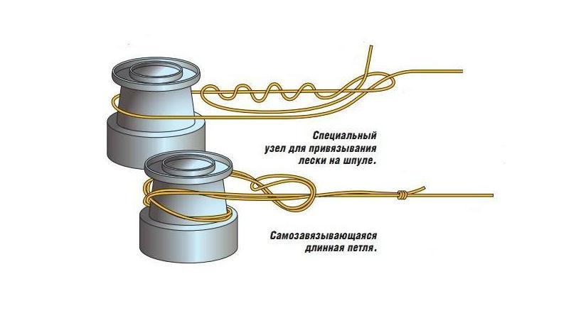 В дорогих катушках, у некоторых производителей, имеется специальное углубление на рабочей поверхности шпули, куда можно легко зацепить шнур и продолжить намотку. Но это скорее исключение, чем правило, потому что на большинстве моделей такой возможности нет, поэтому придется привязывать по старинке. Да так, чтобы плетенка не скользила, а относительно плотно держалась. Пожалуй, это единственное требование к узлу.