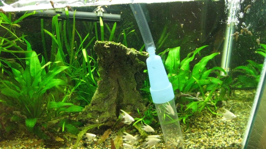 При выкачивании воды соблюдается повышенная осторожность. Процесс требует максимум внимания, чтобы вместе с грязными отходами не исчезли рыбки и другие мелкие обитатели аквариумов