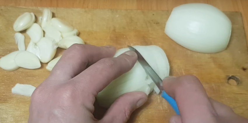 3. Чеснок нарежьте тонкими пластинками, лук — полукольцами, морковь натрите на мелкой терке.