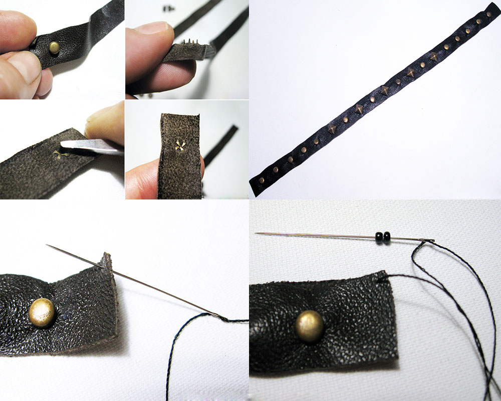 - После крепления всех клепок сшейте обе части кожи между собой, попутно обшивая бисером.