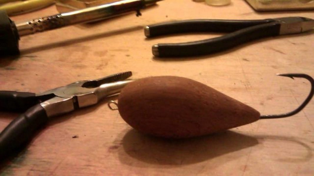 Доработать крючок: примеривая его к болванке, определить оптимальное положение и длину наружной части цевья (чтобы жало было приподнято над поверхностью узкой части). К петле крючка прикрепить проволоку, отмерить отрезок, достаточный для того, чтобы вывести его наружу на широком конце овоида и сделать петлю для крепления снасти к леске.