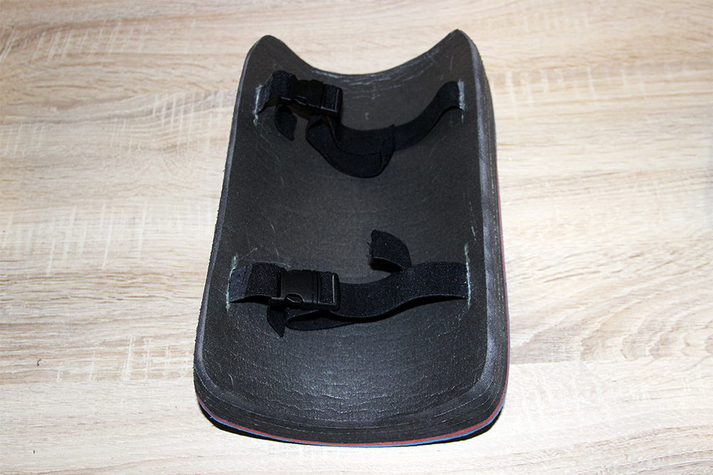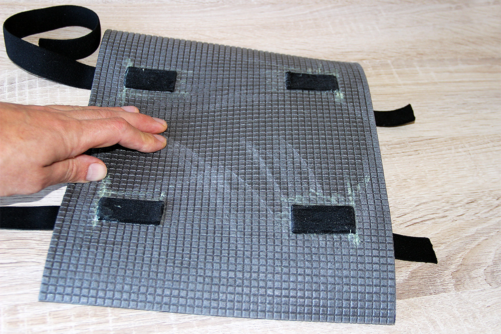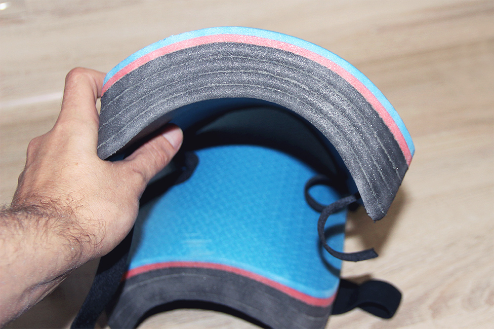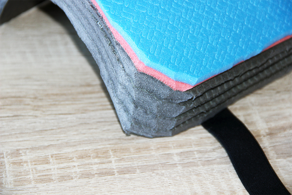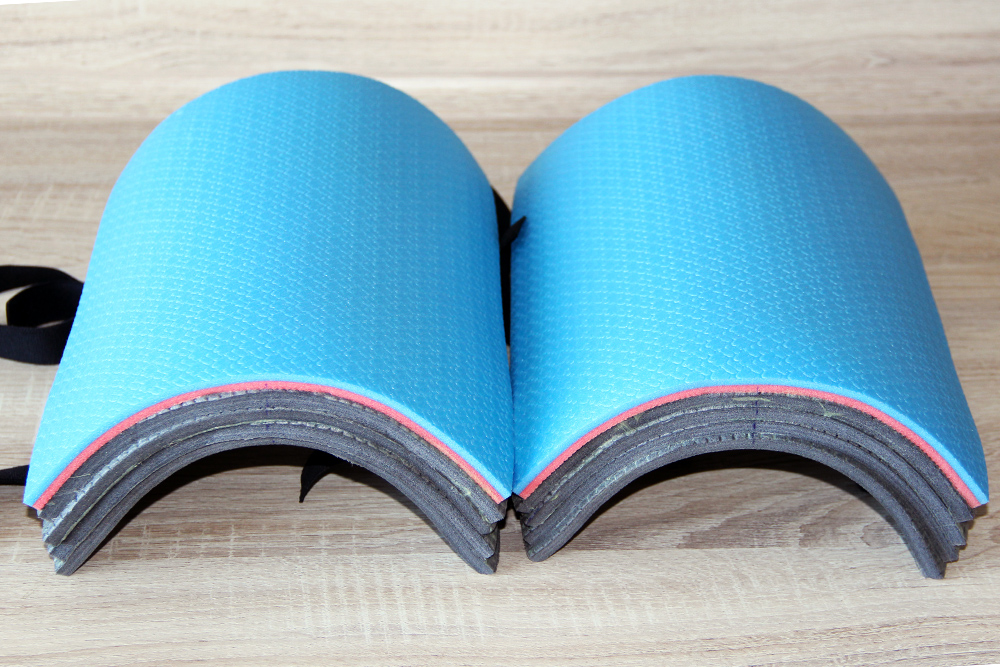 Когда все слои склеены, осталось приклеить прямоугольник с вклеенными лентами на внутреннюю поверхность будущего наколенника. На данном этапе фиксация стрейч-пленкой уже не понадобится, наколенник держит форму самостоятельно! Аккуратно приклеиваем последний стой и дожидаемся высыхания клея. Всех слоев серого коврика мне показалось мало, и какие-то они слишком уж мягкие, поэтому резанул имеющийся у меня, еще один туристический коврик из более плотного материала, и приклеил еще один слой. Вот так выглядят наши наколенники полностью склеенные.