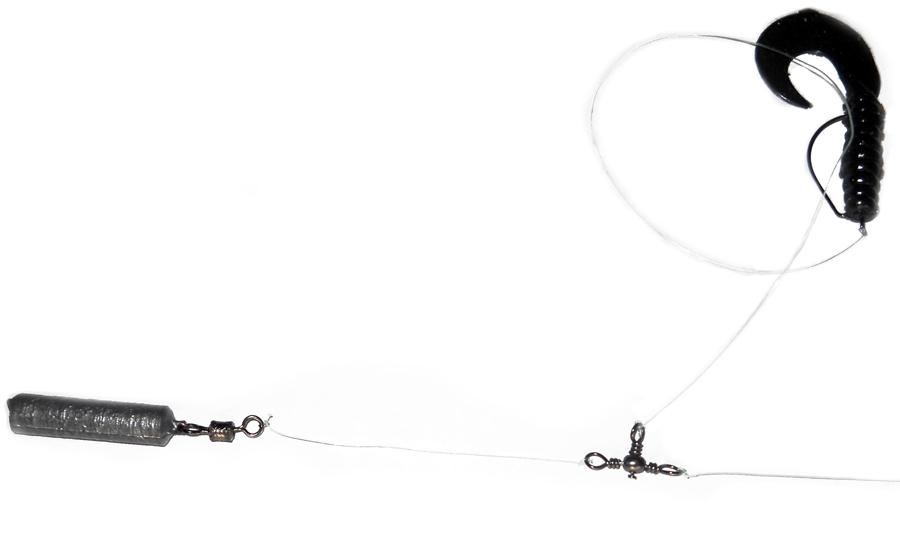 Поводок с грузом свободно перемещается (скользит) по основной леске. Снизу его движение ограничивает вертлюжок, который соединяет основную леску и поводок № 1.
