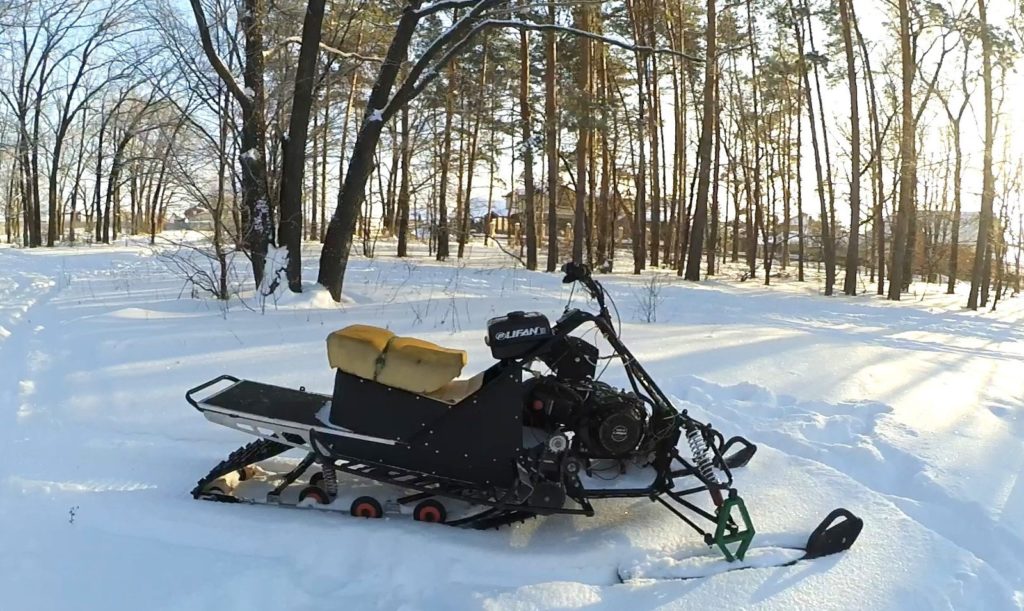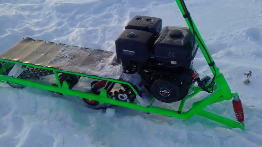 Стоит начать с опоры – установить лыжи под раму. Для облегчения процесса можно использовать снегокат. Затем следует поставить мотор с малой мощностью (примерно 2 лошадиные силы). Его можно извлечь из бензопилы.