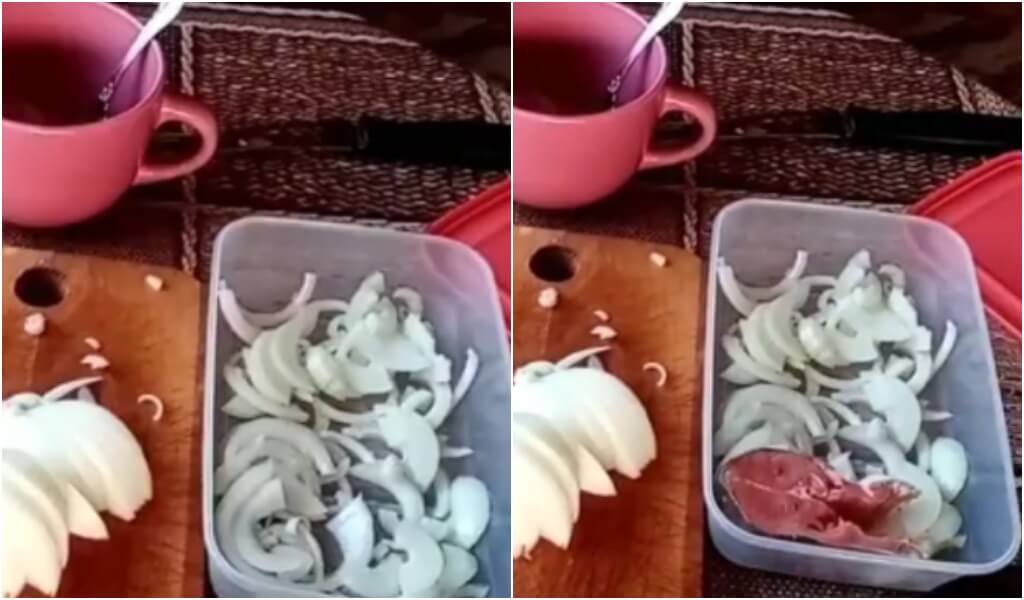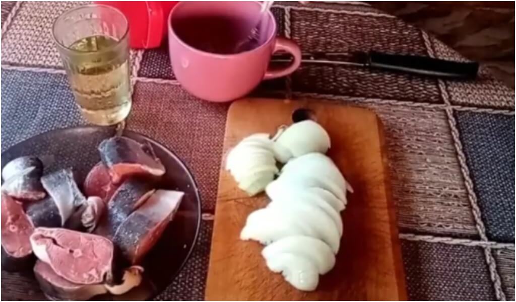 4. Берем любую емкость для готовки. На низ укладываем лук. Затем выкладываем рыбные кусочки.
