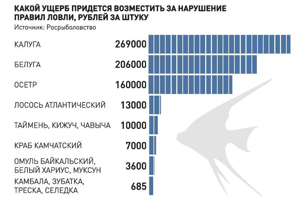 Например, браконьер поймал одного осетра, ранее ущерб государству составлял 16 тысяч рублей. С прошлого года ущерб составляет 160 тысяч рублей за одного осетра. Помимо того что он попадает под уголовную ответственность за один экземпляр осетра, с него еще взыскивается сумма за ущерб запасу ценного вида в казну государства. Если ранее, допустим, в Байкальском регионе браконьера можно было привлечь к уголовной ответственности за поимку более 300-400 штук омуля, потому что ущерб составлял всего 250 рублей за штуку, то сегодня за каждую рыбку — 3,5 тысячи рублей. То есть за гораздо меньшее количество рыбы человек может быть привлечен к уголовной ответственности.
