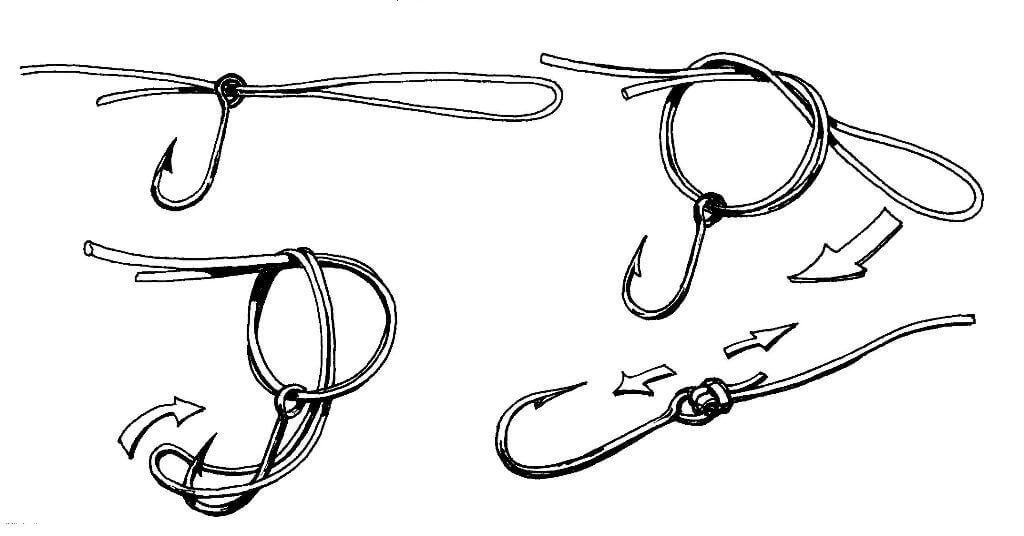 Есть способы и узлы, которые можно вязать для крепления обоих видов крючков. Один из них ─ это Петлевой, вяжется быстро: сложить леску вдвое, если есть колечко, то предварительно кончик продеть в него; завязанная петля укладывается вдоль крючка, ориентируясь на жало.