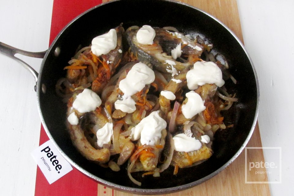 Добавляем сметану. Накрываем сковороду крышкой, убавляем огонь до минимального и готовим рыбу, пока сметана не разойдётся в соус и кусочки карпа слегка в нём не протушатся (ещё минут 7).