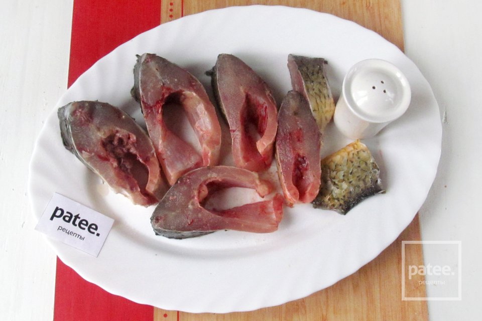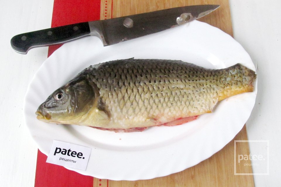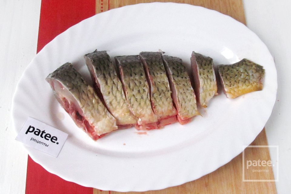 Нарезаем подготовленную тушку карпа порционными кусочками.