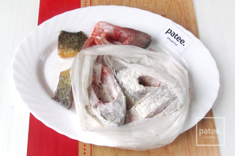 Затем просоленную рыбу, куски карпа, панируем в пшеничной муке. Удобнее всего это делать в обычном пакете.
