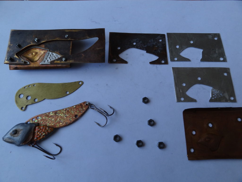 Получившуюся цикаду из пластилина и металлического крыла вдавливают в наполовину застывший гипс, сначала одной стороной, потом другой. Две половины застывшей гипсовой формы совмещаются. В полученной форме проделывают канал и литник. Крыло подвергают окончательной обработке: шлифуют, сверлят отверстия для лески и тройников.