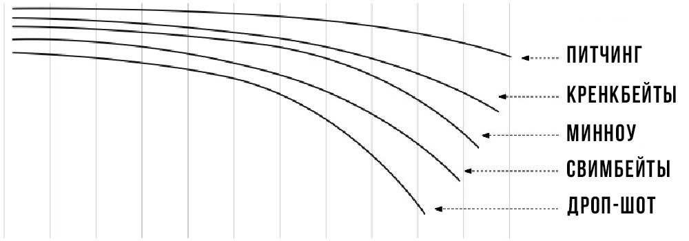Коротко, спиннинги быстрого строя будут сгибаться в верхней трети длины или меньше, спиннинги среднего или умеренного строя будут сгибаться в верхней половине, а удилища медленного строя сгибаются, начиная с нижней трети длины, до ручки. Проще говоря, это то место, где сгибаются удилища. Ниже, (рис.1), привожу иллюстрацию, показывающую соответствие строя спиннинга с техниками заброса приманки, от питчинга (Pitching) до дроп-шота (Drop Shot).