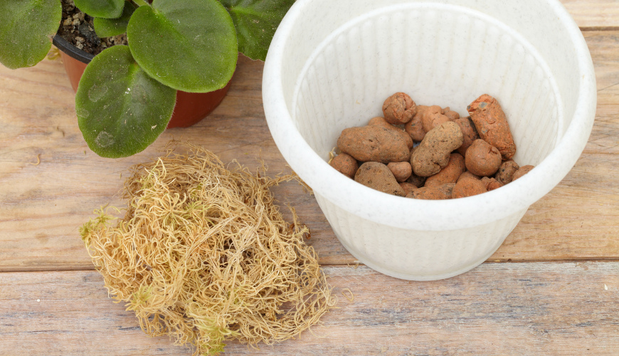 Сфагнум можно использовать как в комбинации с керамзитом, так и сам по себе. Особенно он удобен для маленьких горшков, так как занимает по сравнению с керамзитом гораздо меньший объем.