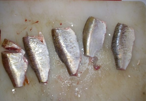 - Теперь следует отделить голову (мелкие особи можно оставить целыми, но необходимо обязательно извлечь жабры из голов) и плавники. Затем следует разрезать брюшко, выпотрошить тушку, не повредив желчный пузырь, снять черные пленки, выстилающие внутреннюю полость рыбы.