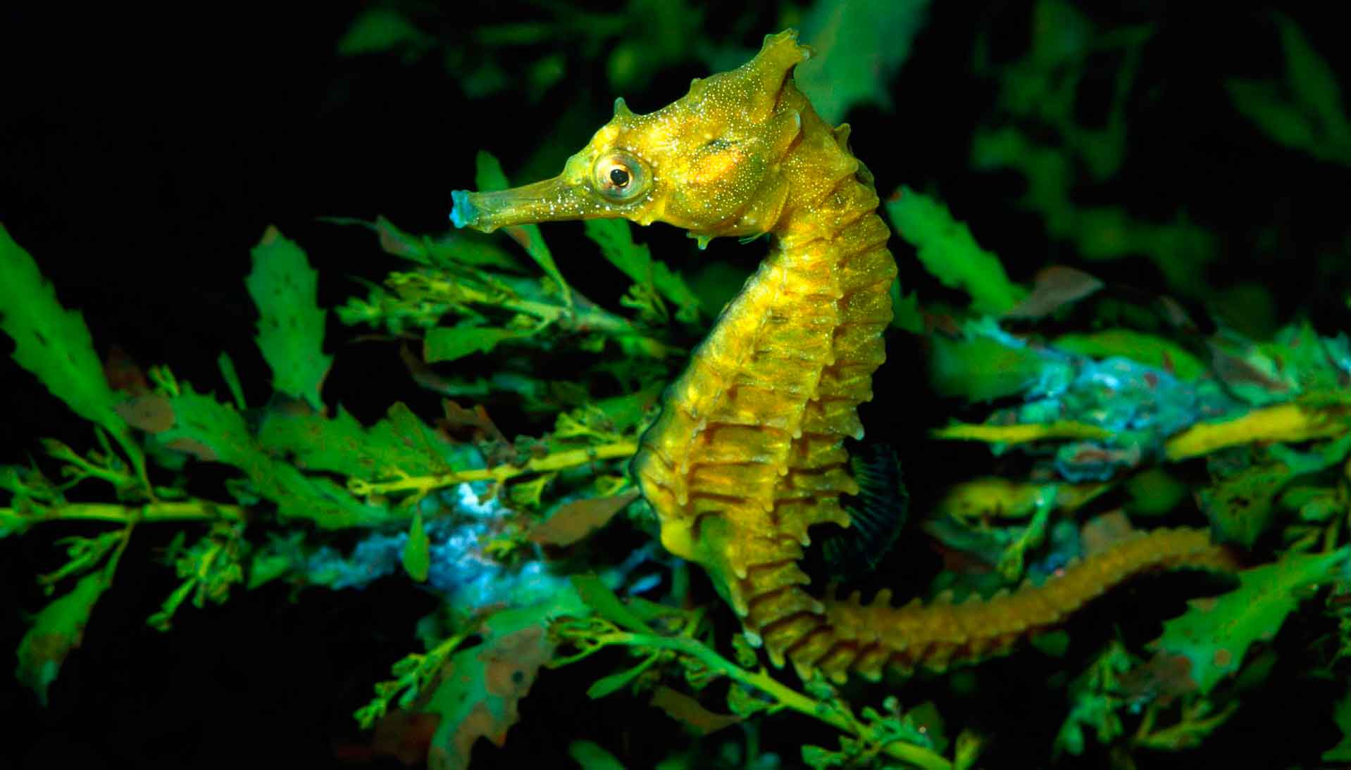 Морской конек предпочитает находиться на дне водоема и прятаться в водорослях