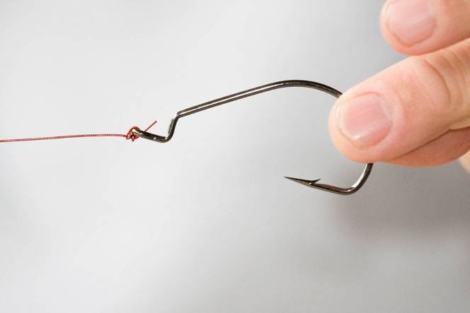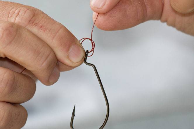 Пропустите конец поводка через ушко крючка. Сделайте петлю. Затем сделайте вторую петлю. Пропустите конец через обе петли. Повторите еще раз.
