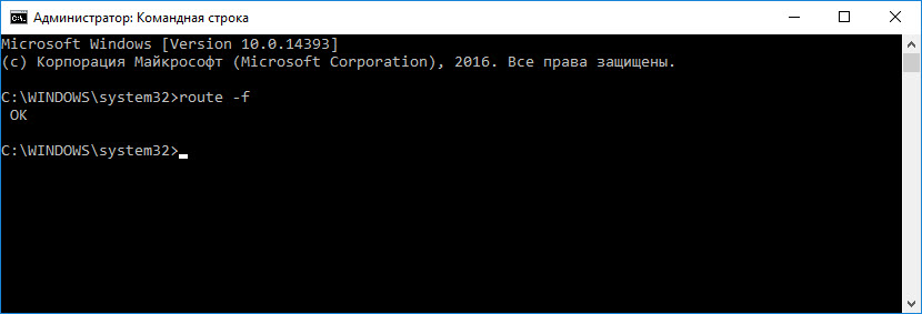Для начала сделайте очистку таблицы маршрутизации. Запустите командную строку от имени администратора, и выполните следующую команду (скопируйте ее в командную строку и нажмите Ентер):