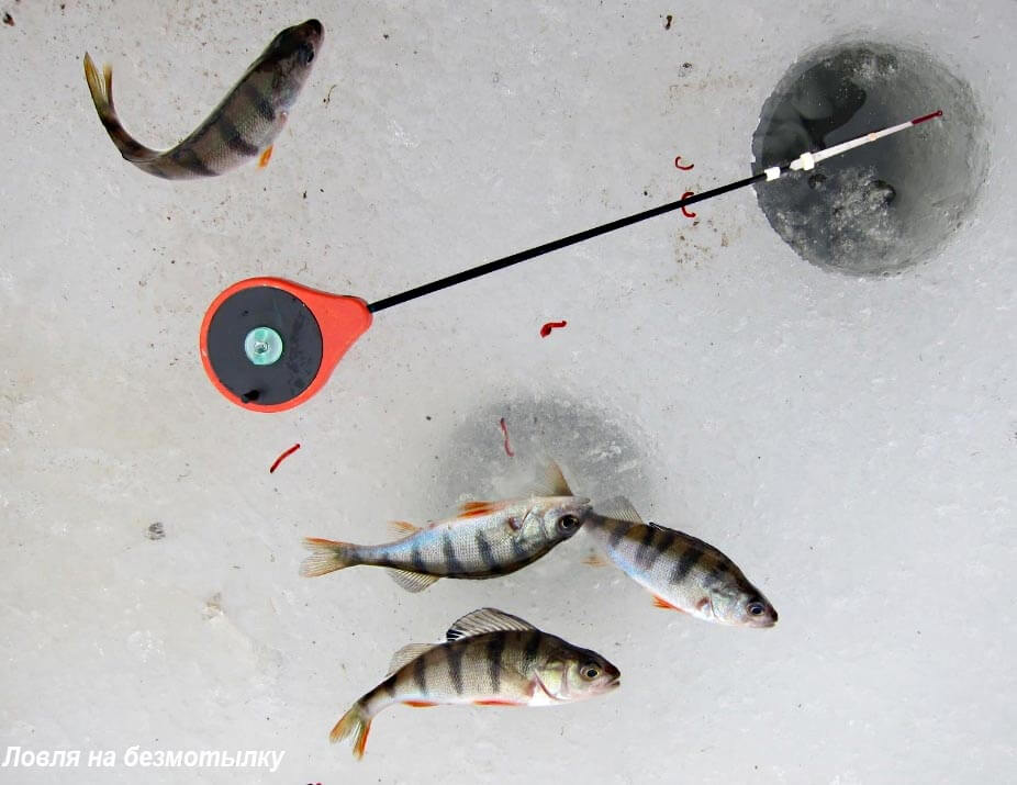 Наука в ловле безмотыльной снастью простая; много лунок — много рыбы. Чтобы поймать следующую рыбу, надо просто отойти и пробурить новую лунку в метре от старой.