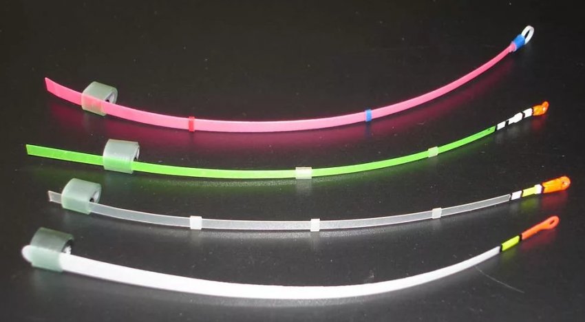 Все кивки также делятся на две группы по способу оснащения. В первой группе, в пластине проделывается небольшое отверстие, куда продевается леска при монтаже. Во второй — леска пропускается через специальный кембрик, установленный на кончике кивка. Рассмотрим плюсы и минусы этих вариантов.