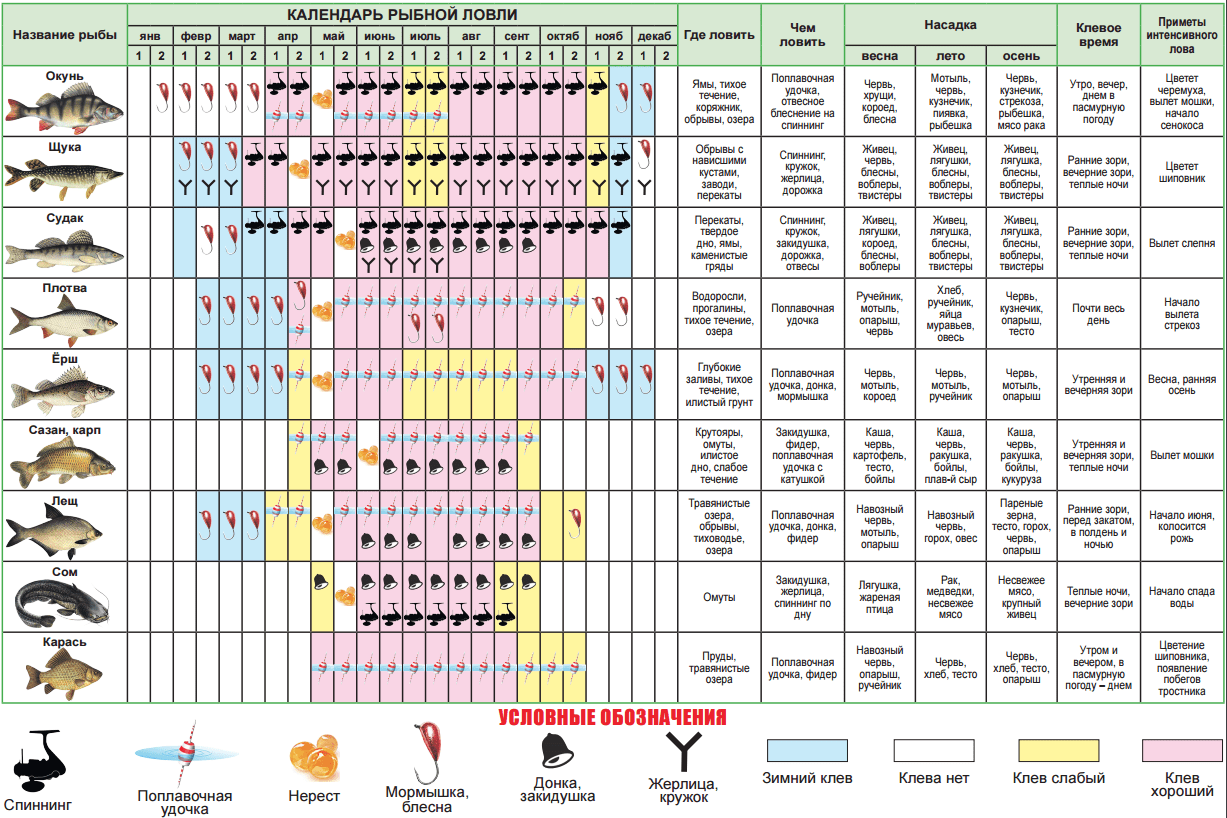 Предлагаем вам календарь рыбака на щуку и других наиболее часто встречающихся в улове рыб — окуня, судака, плотву, ерша, карпа (сазана), леща, сома и карася. В нём отражены такие показатели, как: