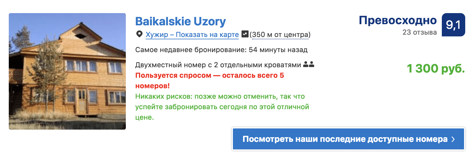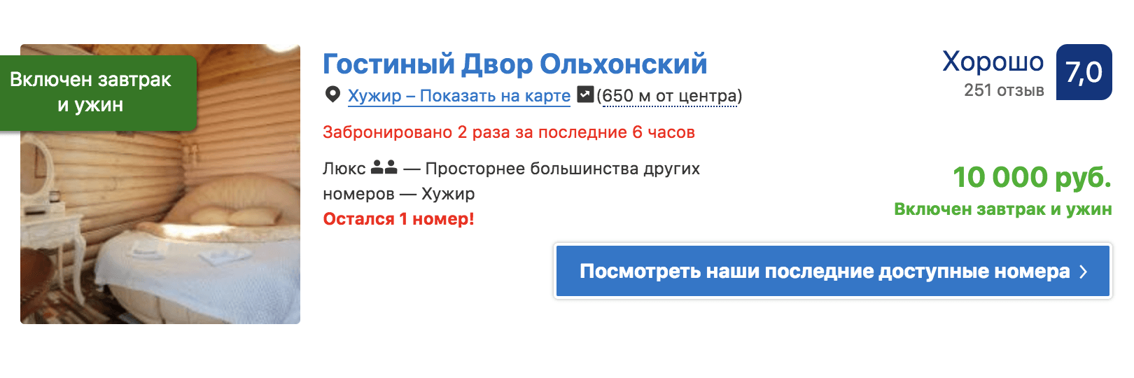 Одна из лучших местных гостиниц по рейтингу «Букинга» — «Байкал-вью», ее показывали в программе «Орел и решка». Находится она недалеко от Хужира. Все номера гостиницы — это одноэтажные разноцветные домики с отличным видом на пляж, стоят они от 5000 Р за ночь.