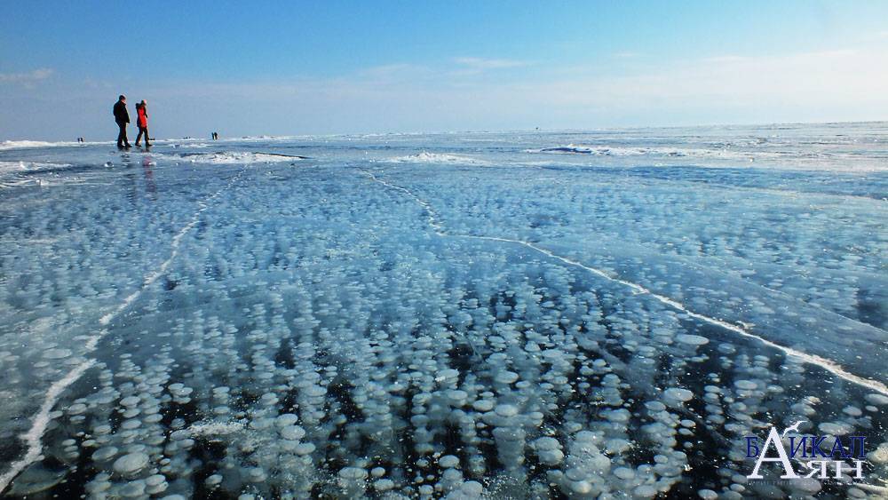 Пузырьки на Байкале ищут все туристы, потому что это очень необычное явление. Когда со дна озера на поверхность поднимается газ метан, он по дороге замерзает и превращается в такие белые пузыри. Если в местах скопления пузырей сделать отверстие и поднести спичку, то газ будет гореть как газовая конфорка. Такие небезопасные эксперименты даже снимали на видео. Вот такие они, пузыри: