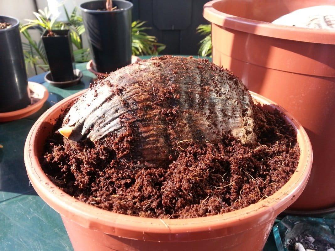 После того как выбран материал, перед посадкой орех замачивается на трое суток в воде, характеристики которой максимально приближены к природным, то есть вода должна быть подсолена и теплой. Кокос наполовину погружается в торф или песок с постоянной температурой 30 градусов тремя глазками вверх. Когда из одного из глазков проклевывается росток, можно переходить к следующему этапу.