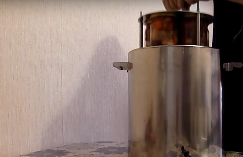 После этого на них надевают крышки и закатывают консервным ключом. Домашний автоклав устанавливают на газовую плиту и на максимальном огне доводят температуру в аппарате до 110 градусов, а затем удерживают ее в течение 1 часа. По истечении времени плиту выключают, а банки оставляют в аппарате до полного остывания.
