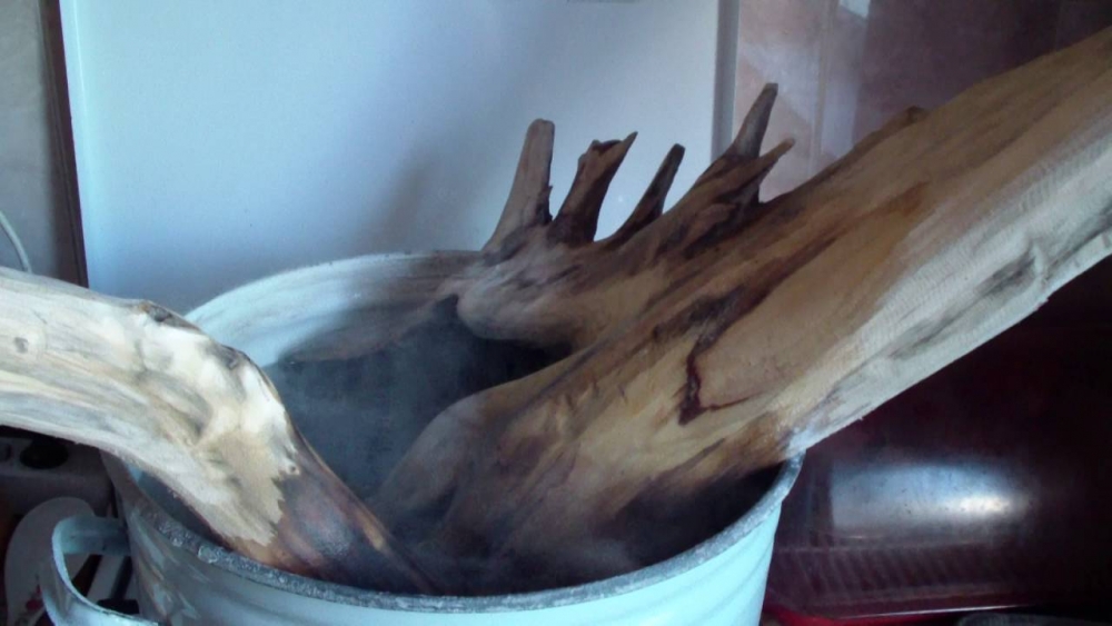 Варить корягу нужно в растворе соли (пятьсот граммов на половину литра воды) 6-12 часов. Чем дольше варится древесина, тем более темный оттенок приобретает. После варки нужно поместить ветвь под проточную воду или в большой резервуар, чтобы она полностью была погружена в воду.