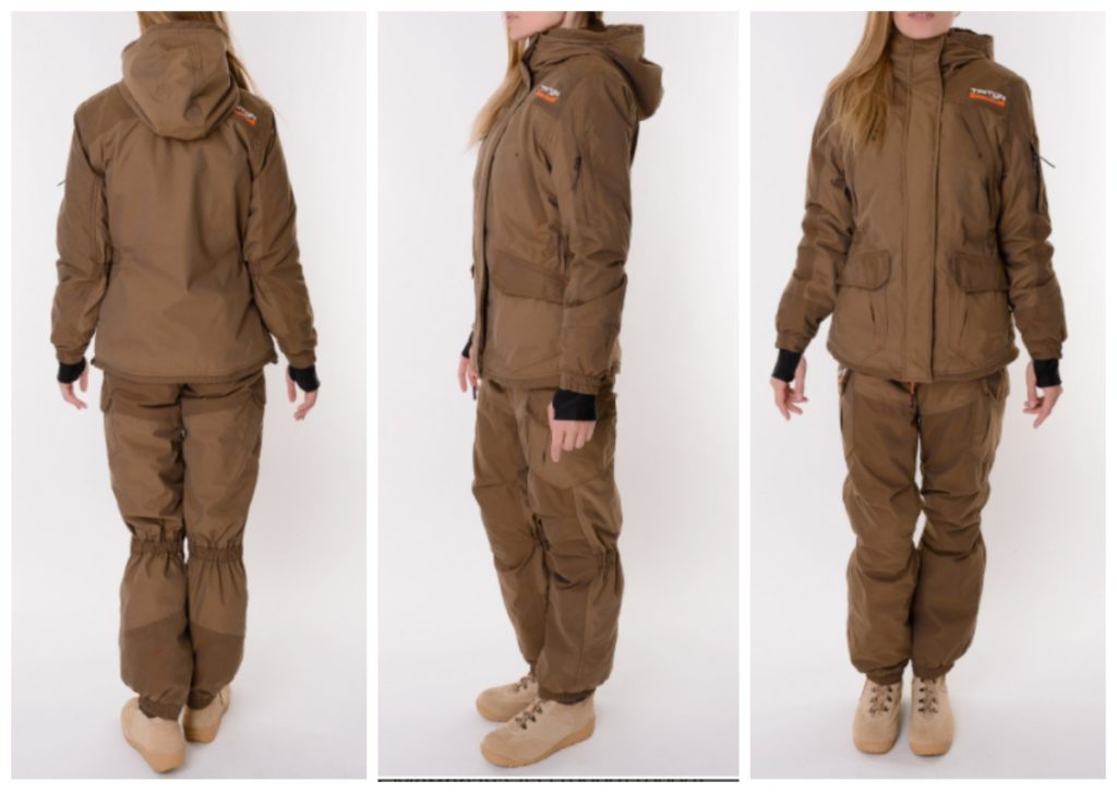 Отделка из таслана, основной материал изготовления — алова. Удлиненная куртка оснащена центральной бортовой застёжкой. Покрой не стесняет движений. Куртка также имеет ветрозащитный клапан на кнопках, съемный утеплённый капюшон, стягивающийся шнуром по лицевому срезу. 2 кармана на молнии, 2 накладных на кнопках. Утеплитель — термостежка. Низ рукавов обработан манжетой и оборкой — лучше сохраняют тепло, снижает риск попадания на тело клещей в теплое время года.