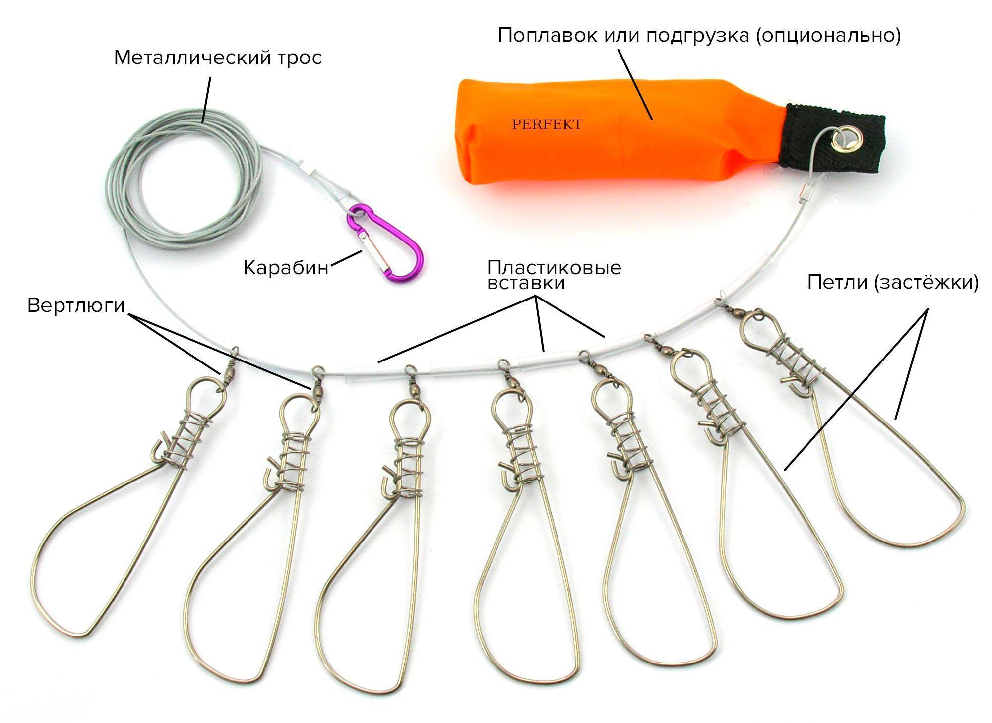 - Петли из проволоки или застегивающиеся крючки (застёжки), на которые надевается рыба. Как правило, в количестве от 5 до 10 шт.
