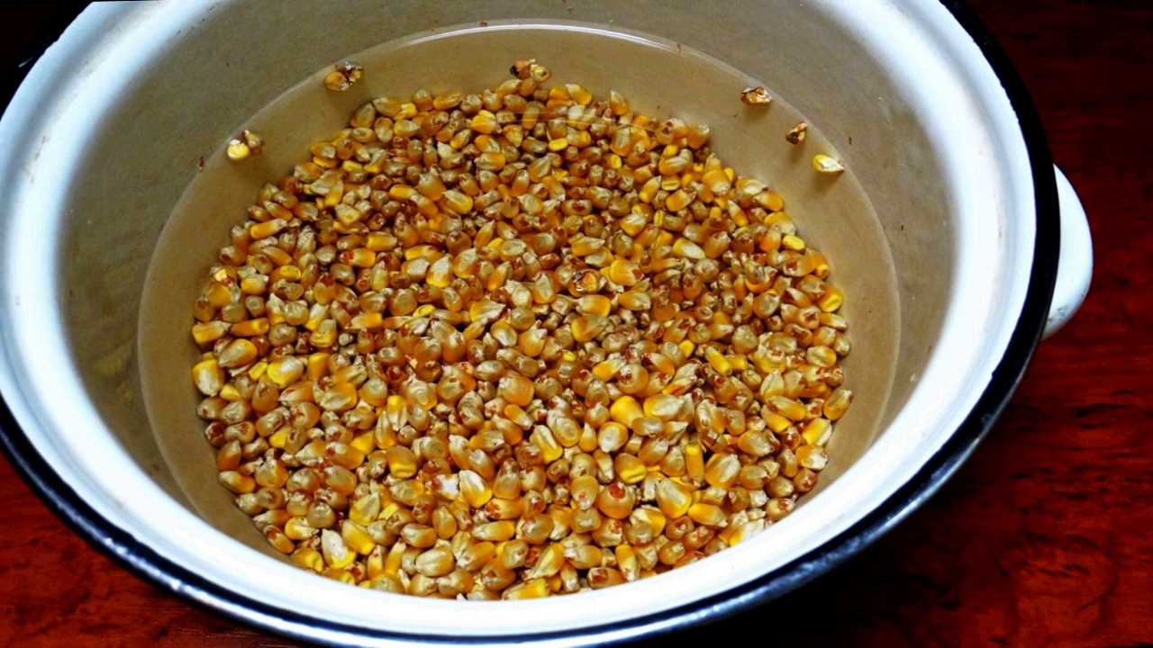 Кукурузные зёрна засыпаются в кастрюлю, промываются и оставляются после этого на сутки, залитые водой, причём с запасом, так как зёрна всегда впитывают очень сильно воду и будут увеличиваться.