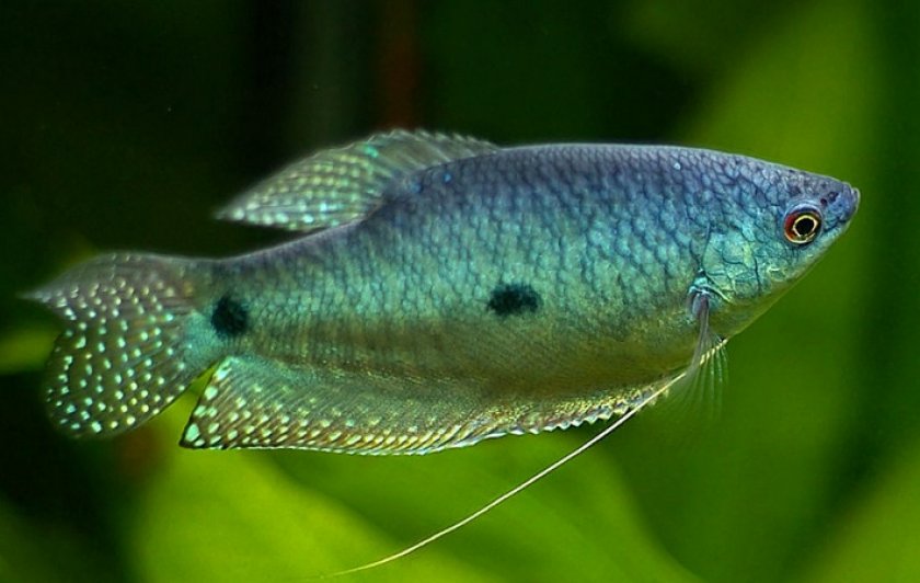 Гурами — плавающий любимец среднего размера (10–11 см), который имеет характерный серебристый цвет и крупные плавники, заканчивающиеся как нитки. Это обусловлено тем, что данный вид привык жить в мутной воде Индонезии и под водой всё делать на ощупь.