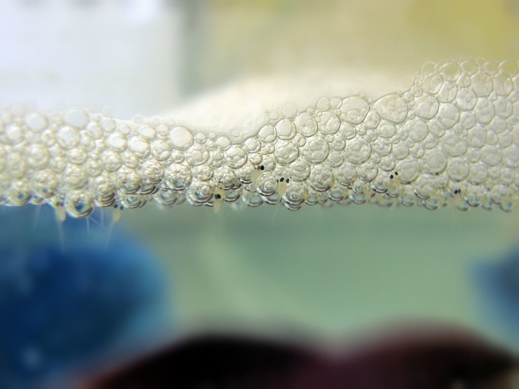 Самец морально созревает для размножения раньше, проявляет готовность заметнее и злится, что у самки более заторможено приходит понимание. Он начинает строить гнездо раньше, чем появляются икринки. Гнездо лабиринтных рыб – это произведение архитектуры, сооруженное из мельчайших пузырьков воздуха, склеенных между собой и плавающих на поверхности в виде мягкой и практически невесомой пены. Часто они находятся с обратной стороны крупных листьев растений.