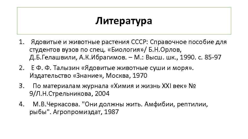 Литература 1. Ядовитые и животные растения СССР: Справочное пособие для студентов вузов по спец.