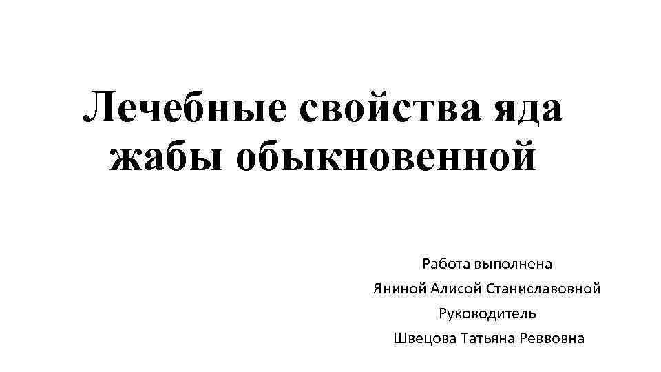 Лечебные свойства яда жабы обыкновенной Работа выполнена Яниной Алисой Станиславовной Руководитель Швецова Татьяна Реввовна