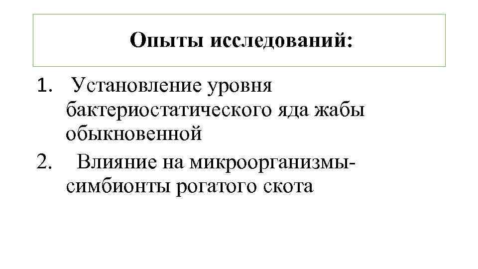 Опыты исследований: 1. Установление уровня бактериостатического яда жабы обыкновенной 2. Влияние на микроорганизмысимбионты рогатого скота