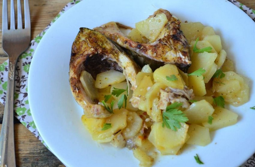 Отличное блюдо, которое сочетает в себе рыбу с готовым гарниром. Для приготовления рекомендую брать крупный речной деликатес (на 800-900 гр.) и лучше всего молодой картофель.