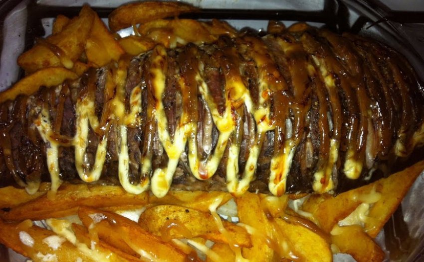 - Поверх них положите тонким слоем лук и обильно смажьте подготовленным соусом.