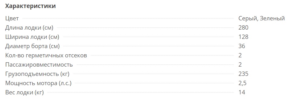 Двухместная конструкция подразумевает установку мотора до 2,5 л.с. При этом габариты плавательного средства скромные — длинна 280 см, ширина 1,28 м. Для удобного хранения рыболовных снастей в корме предусмотрено расширение. Масса конструкции достигает 16 кг. Это относительно немного с учетом двух местной системы.