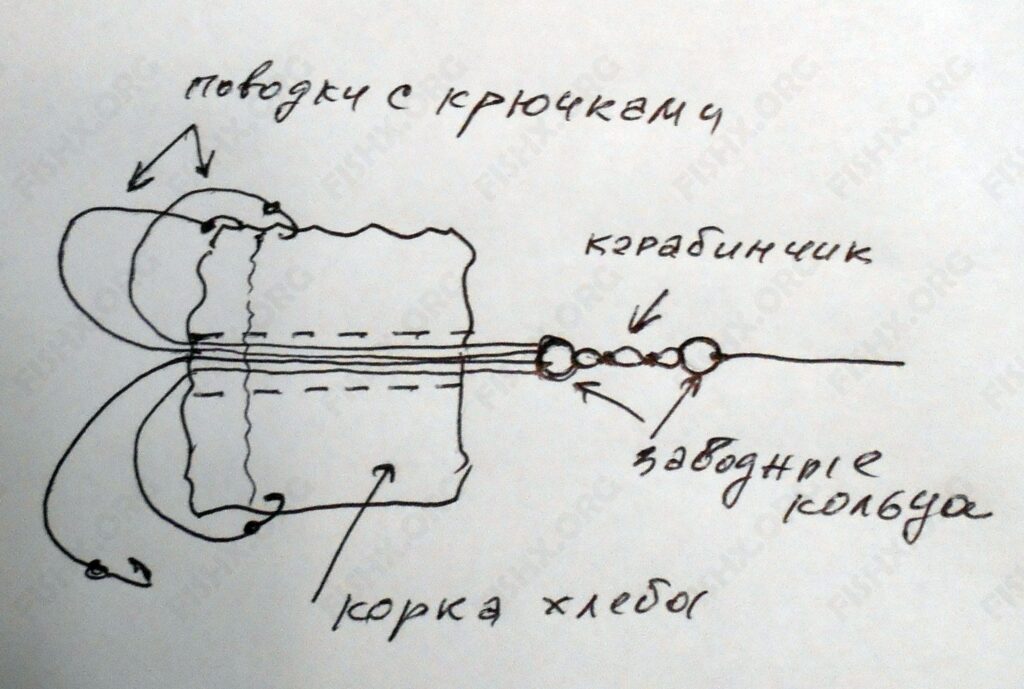 Ловить он собрался на фидер, но вопреки обычной оснастке, решил использовать свободно скользившую по леске кормушку-грузило, которая в конце снасти упиралась в заводное колечко с карабинчиком. С другой стороны к заводному кольцу были привязаны четыре поводка, примерно по 15 см, с крючками. Карабинчик можно было легко снять с кольца и продеть поводки сквозь отверстие, проделанное в хлебной корочке (квадратику со стороной 3 см). Крючки втыкались в края насадки по кругу и утапливались в ней. Вот и вся конструкция (показано на рисунке).