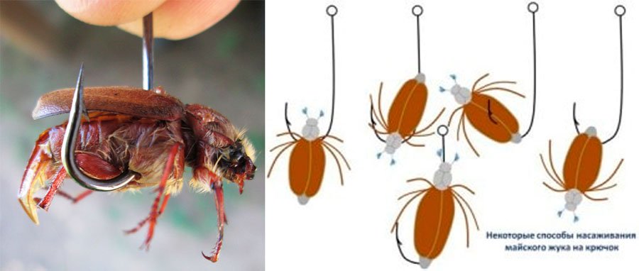 Используя донную либо поплавочную снасть, можно ловить рыбу на майских жуков. Для этого на крючок насаживают пару насекомых. Жало оставляют оголенным. Можно перед насадкой оторвать у жука жесткие надкрылья.