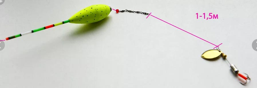 Собрать спиннинг на щуку с бомбардой может быть полезно в некоторых узких случаях. К примеру, когда у рыболова грубый тяжелый спиннинг, а забрасывать нужно легкие вертушки или стриммеры. Оснастка для ловли щуки на бомбарду такая же, как и в других случаях – на конце шнура вертлюжок, перед которым свободно ходит поплавок сбирулино. Дальше – кусок флюорокарбона или металлический поводок.