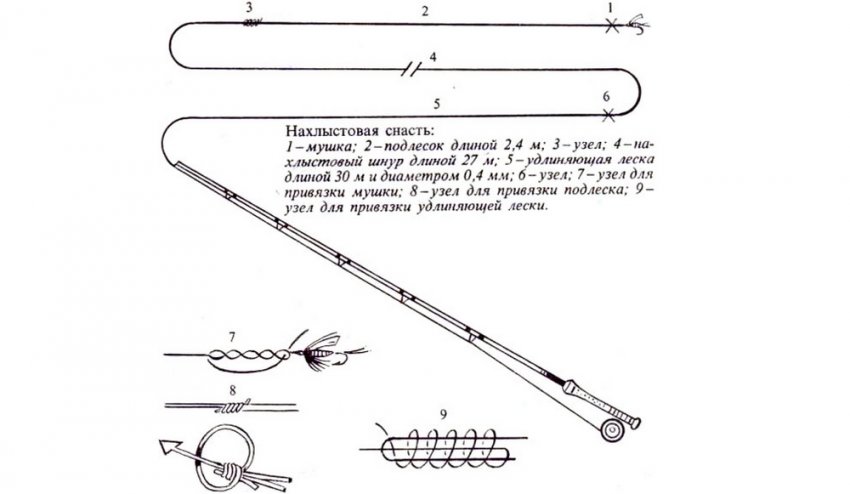 В качестве беккинга (дополнительный шнур) используют леску. Поводок для такой снасти должен иметь длину 2,5 м. В качестве приманки на нахлыстовую систему берут мушку.