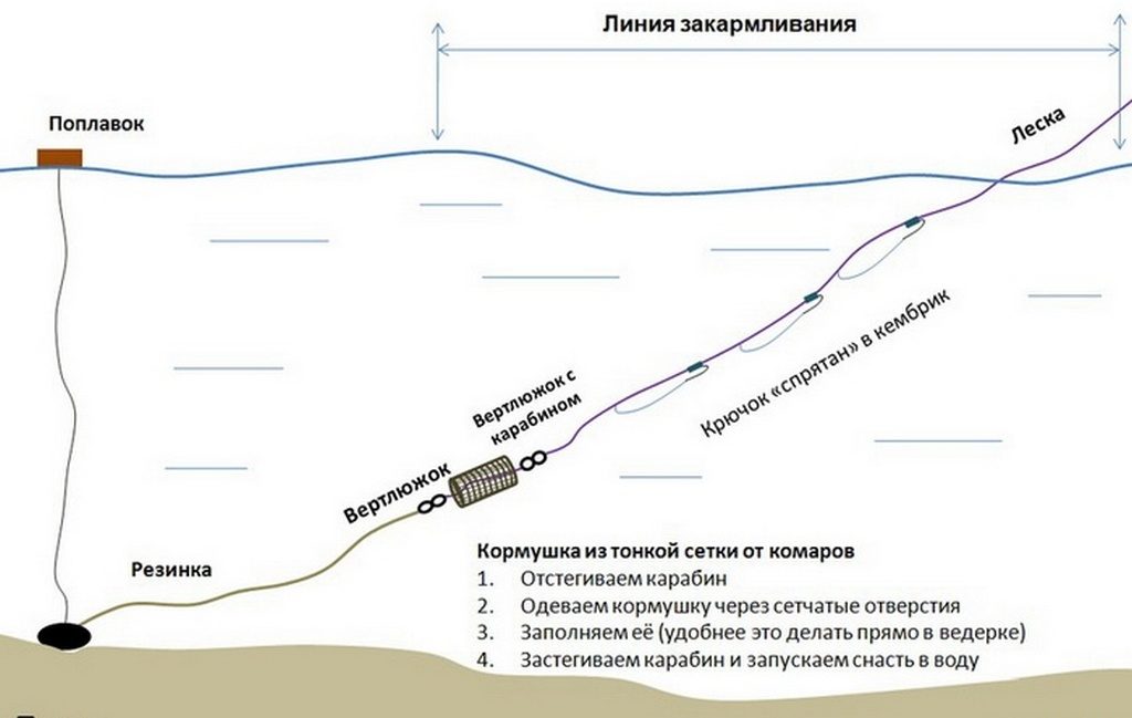 Прикармливание осуществляется малыми порциями, применяя кормушки малой вместительности. Если есть опасность насытить рыбу, можно оснастить фидер грузилом.