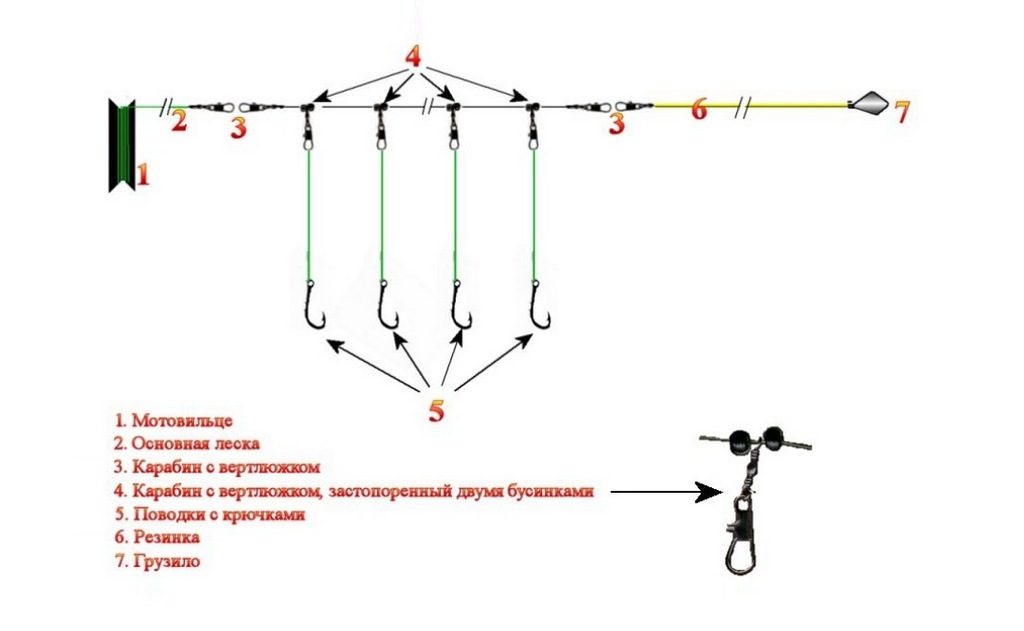 Длина поводков варьируется от 20 до 40 см, количество от 7 до 10 штук. Средняя длина используемой резины 7-10 метров, лесы 30-40 м. Диаметр основной лески 0,3-0,4 мм, поводков 0.15 – 0,2 мм.
