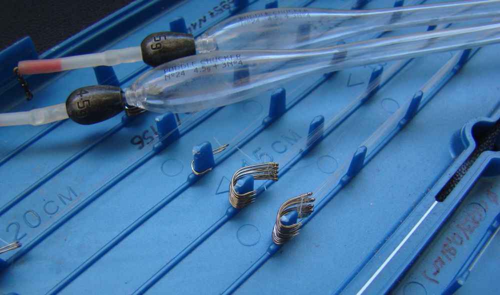 Для основного шнура используют мягкие монолески, диаметрами от 0,2 мм в цвет воды на водоёме. Поплавки берут с глухим креплением, осуществляемым при помощи ниппельных резинок. Форма сигнализатора особо на лов не влияет, главное, чтобы была отчётливо окрашена антенна аксессуара. Грузила в виде резаных дробинок с креплением от их зажима и удобны, и эффективны для набора необходимых для огрузки поплавка масс. Крючки на карпа вяжут на поводках на 0,02 мм меньшего диаметра по отношению к основной леске. Длина поводка колеблется в пределах 20–30 см. Сами же крючки используют в пределах нумерации от 8 до 12, применяя конструктивы с укороченным цевьем.