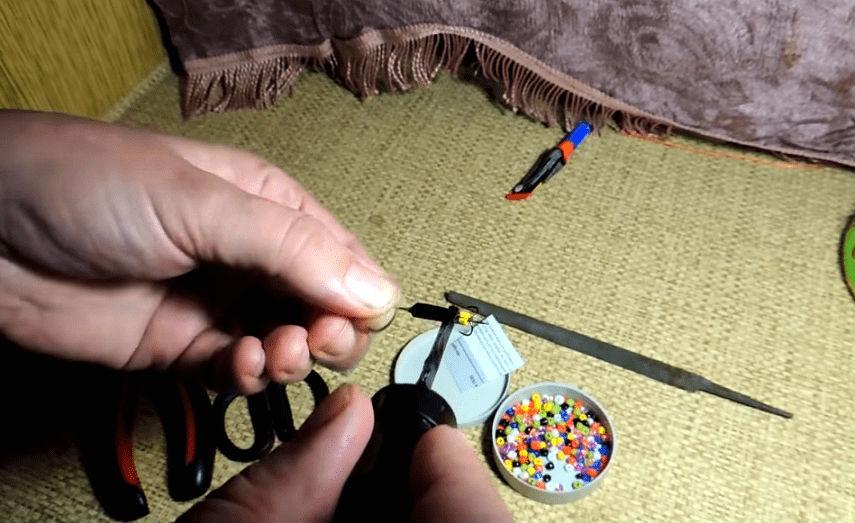 Сначала подготавливают крючки, откусывая ушки и спаивая цевье между собой. Затем формируют конус из фольги, фиксируют его на деревянной доске, устанавливают тройник и ушко для крепления к леске, и заливают расплавленный свинец. Дождавшись, пока он застынет, напильником, надфилем и наждаком обрабатывают заготовку, придавая ей необходимую чистоту. Оснащают чертик бисером или отрезками кембрика и, перед выходом на водоем тестируют его в банке с водой.