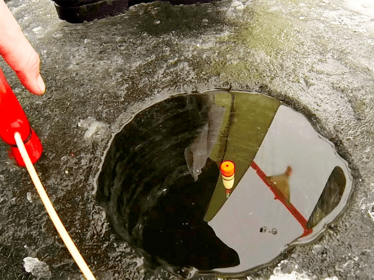 - Затем удочка перемещается плавно к другому краю лунки и действия повторяются.
