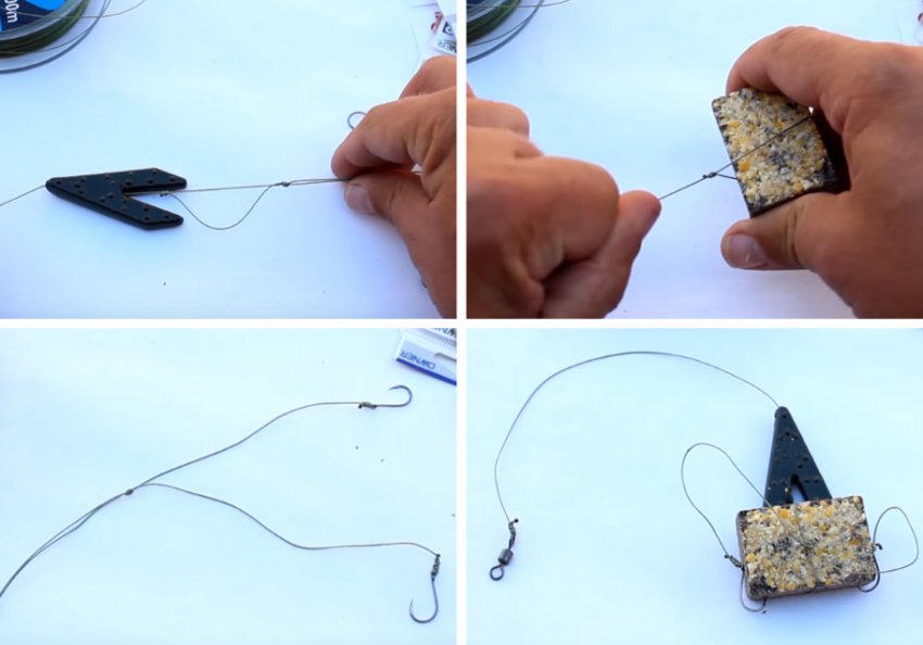 На основной леске необходимо прочно закрепить кормушку и установить бусинку для стопора. Из плетёного шнура нужно сделать 4-5 поводков, затем закрепить их по всей окружности кормушки на одинаковом расстоянии. При дальнем забрасывании следует дополнительно установить груз. Для береговой ловли удобно использовать снасть, утяжелённую весом приспособления для корма и наполнителя.